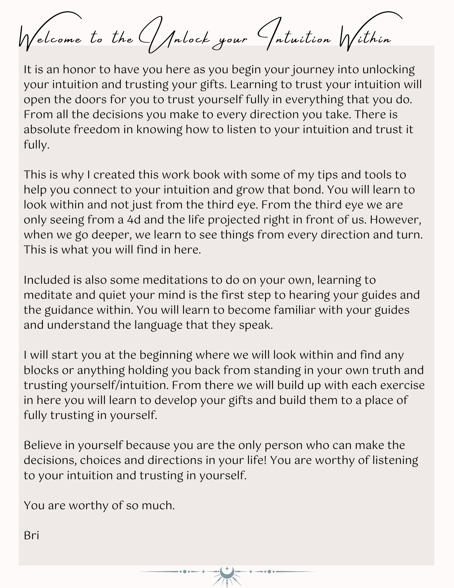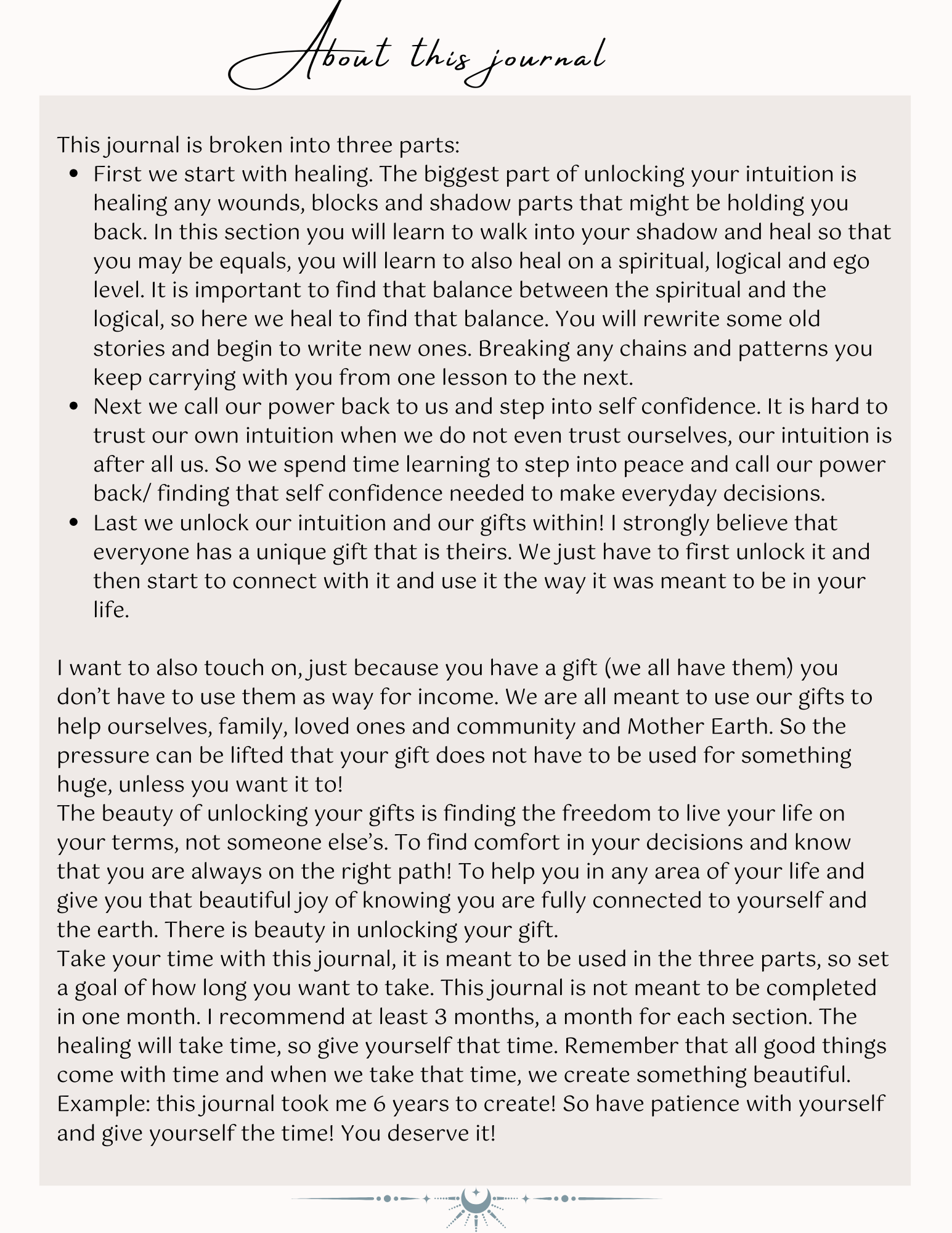 The Unlock Your Intuition Within Journal is a 60-page guided journey designed to help you heal, reclaim your energy, and awaken your intuitive gifts. Thoughtfully crafted with meditations, healing rituals, and guided journaling, this journal is intentionally broken into three transformative sections to support you step-by-step: