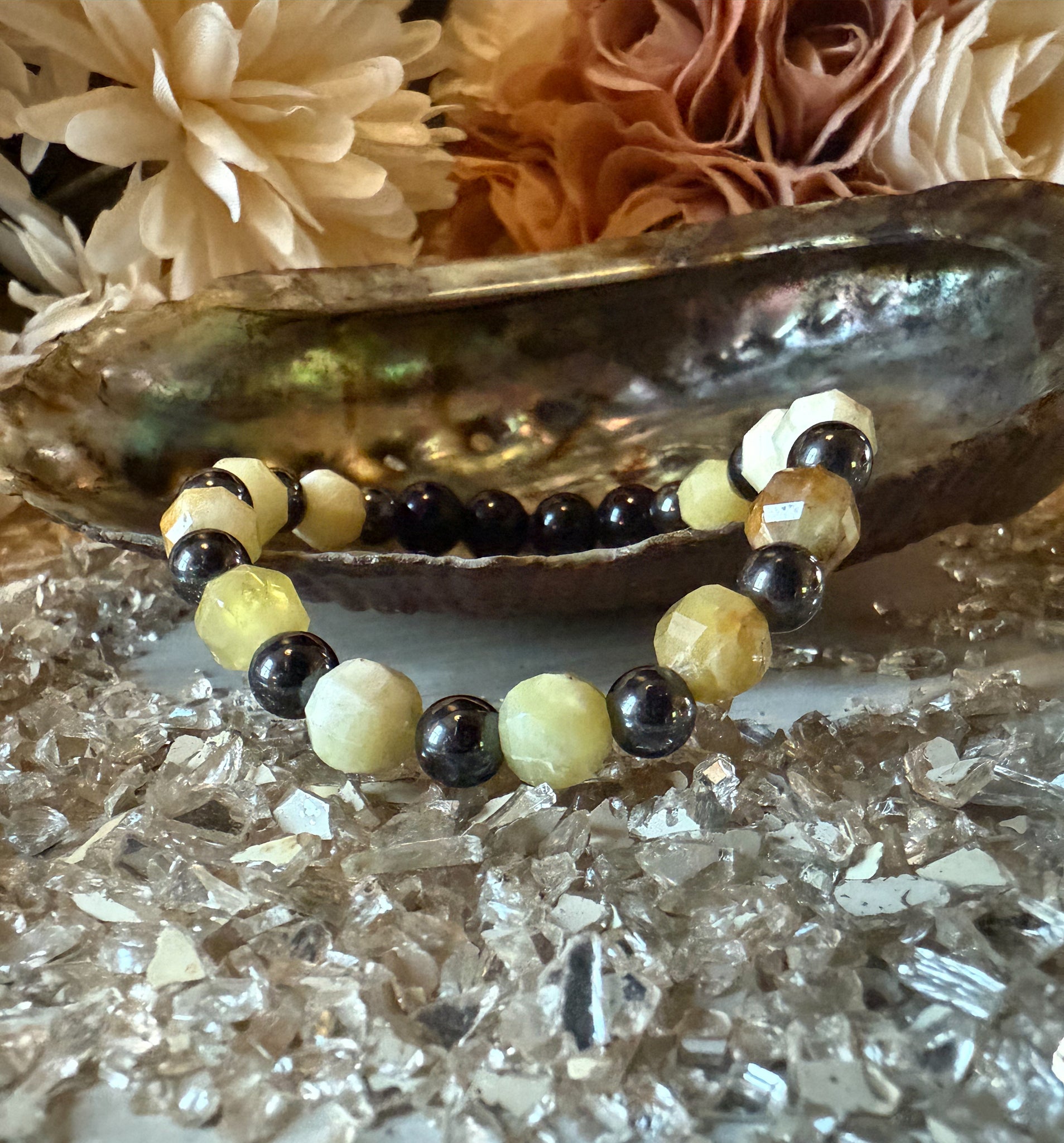 This bracelet combines the sunny energy of Yellow Jade, the grounding clarity of Hematite, and the protective strength of Onyx — creating a powerful blend to keep you both empowered and balanced.